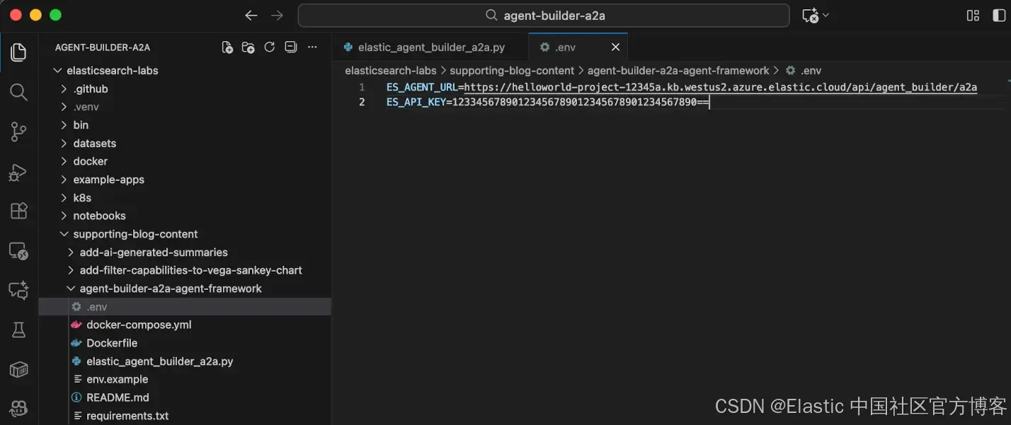 回到 Visual Studio Code,在 .env 文件中找到占位符文本 "YOUR-ELASTIC-AGENT-BUILDER-URL>",并粘贴复制的 MCP Server URL 来替换占位符文本。现在编辑粘贴的 MCP Server URL。删除 URL 末尾的 "mcp" 文本,并替换为 "a2a"。编辑后的 URL 应该看起来像这样: