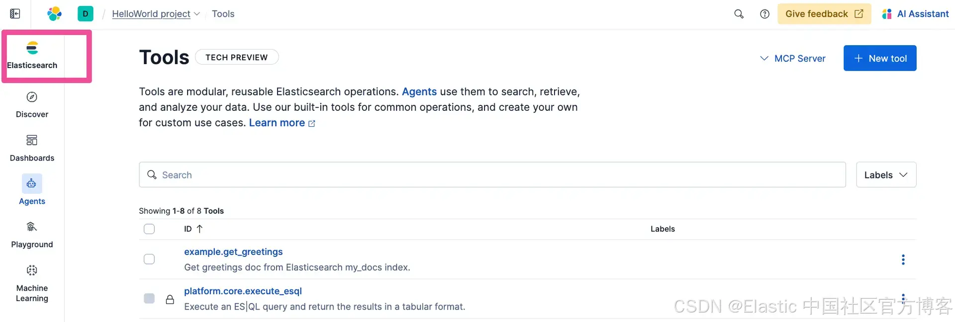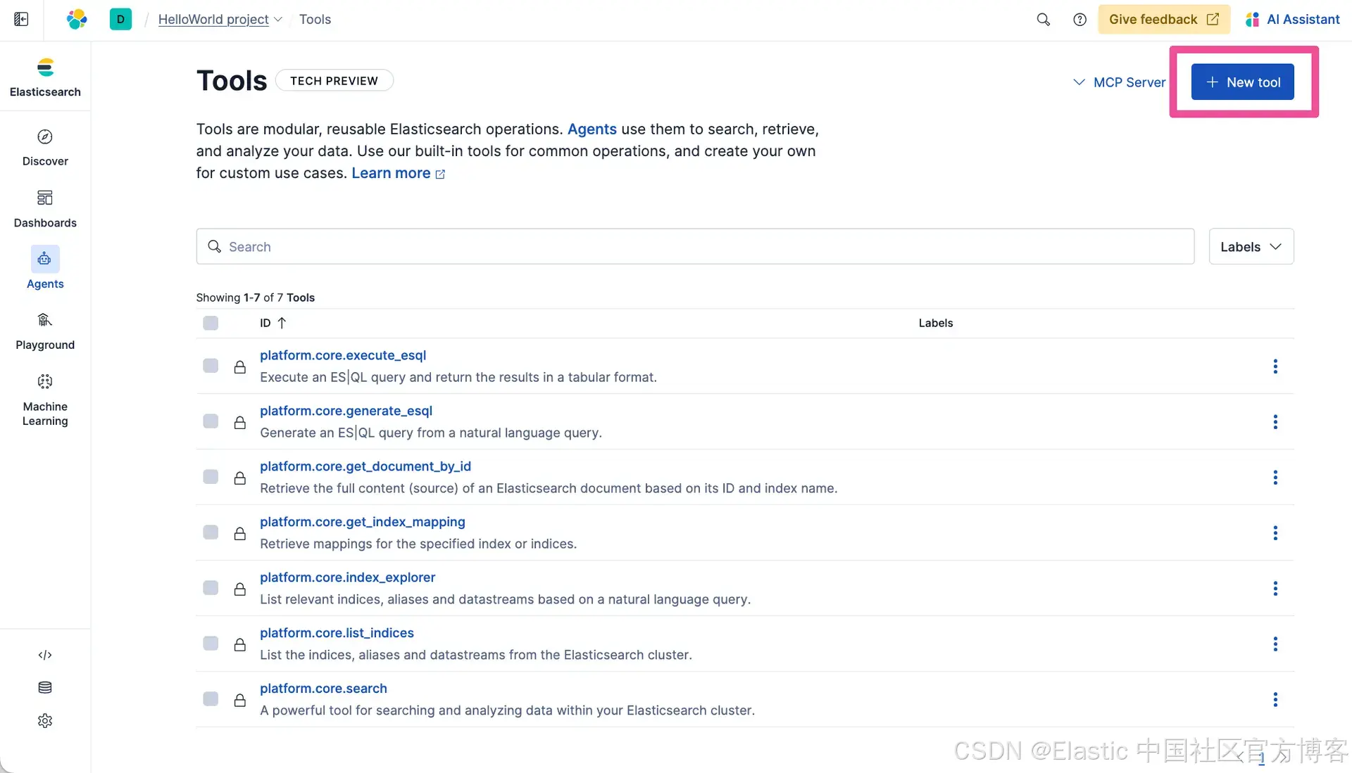 如你所见,Elastic Agent Builder 中的默认 agent 已经可以用来与你的数据聊天,但要真正赋予 agent 自定义能力,它们需要通过 Model Context Protocol (MCP) 访问 tools。Agent Builder 拥有完整的 tool 创建和管理功能,你可以用它快速创建自定义 MCP tools,这些 tools 会托管在与数据相同的可扩展 Elastic 项目中。