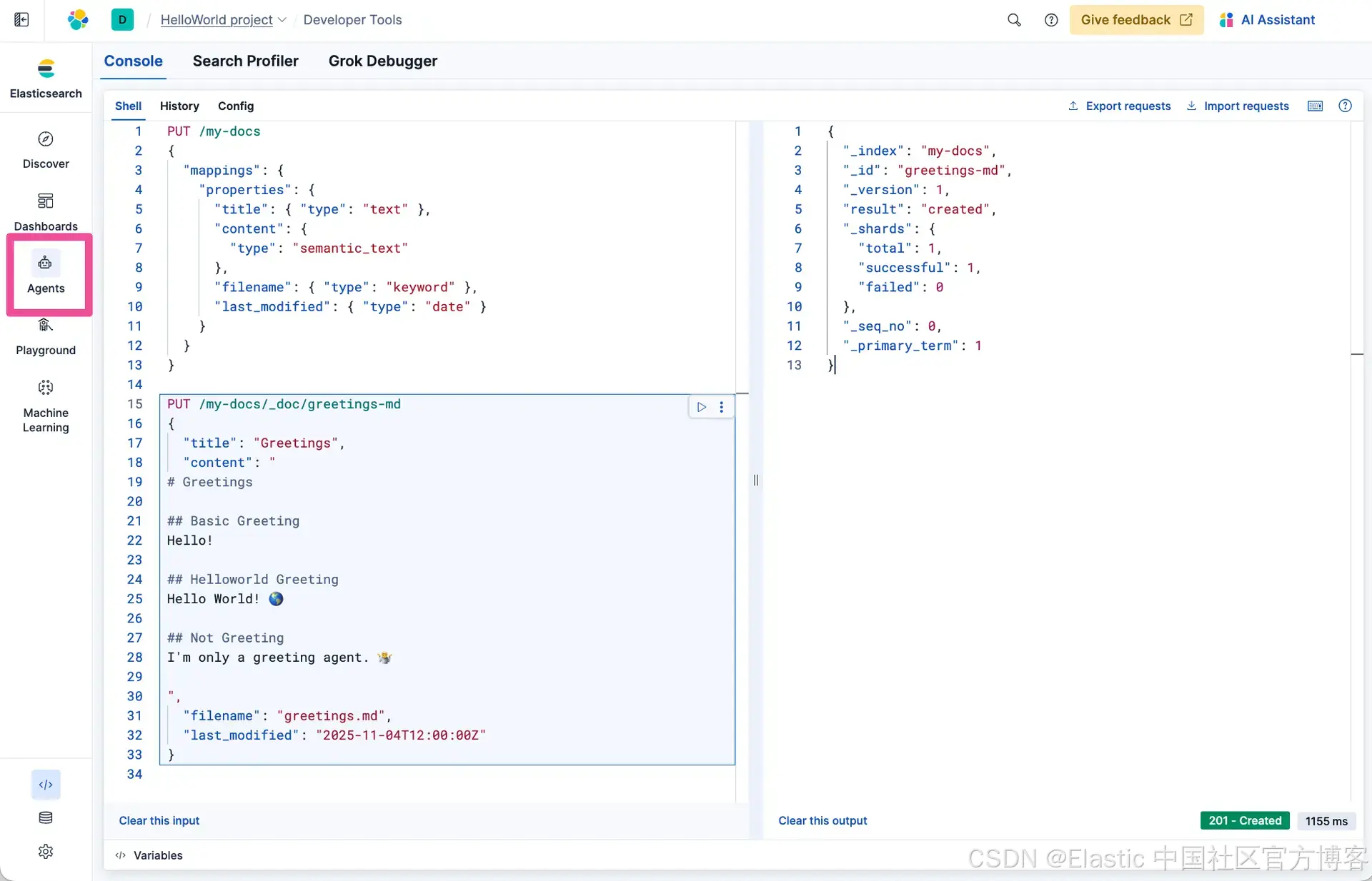 此演练的下一步是创建一个能够使用存储在 Elastic 中数据的 agent。