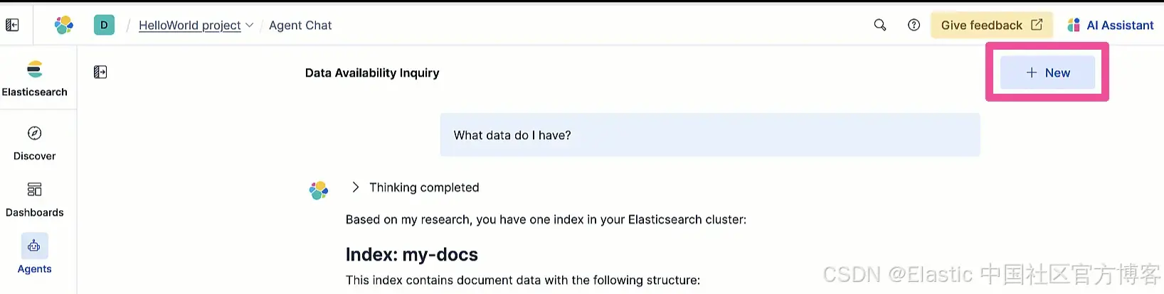 现在我们已经在 Elastic 索引中有了一些数据,让我们确认一下可以使用的数据。利用 Agent Builder 中默认启用的内置 Elastic AI Agent,你现在可以就你的数据进行对话。在导航菜单中选择 Agents。