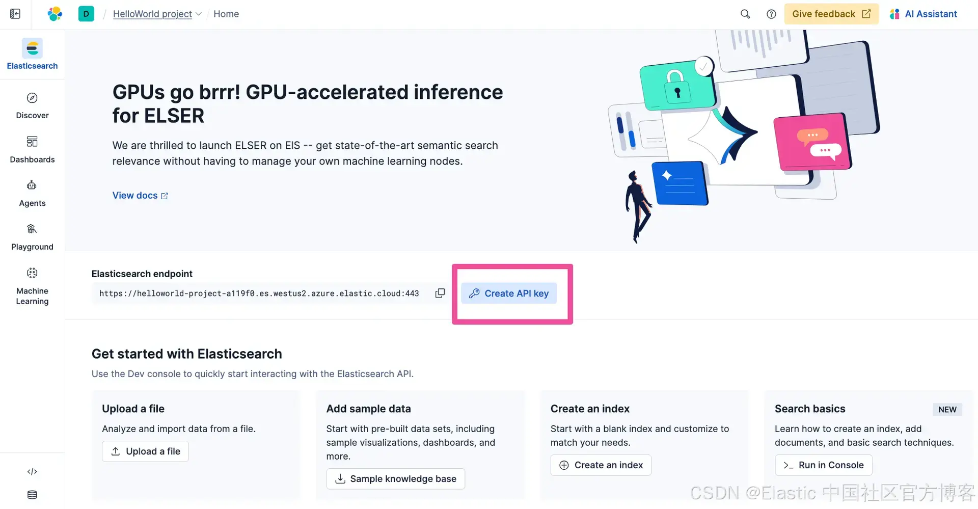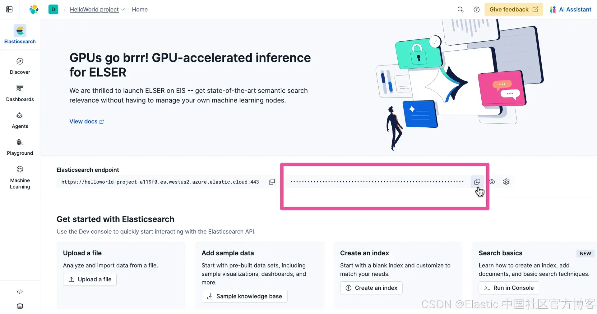 下一个需要在 .env 文件中替换的占位符文本是 。我们将用来自你的 Elastic 项目的实际 API Key 替换它。回到你的 Elastic 项目,在导航菜单中点击 Elasticsearch。