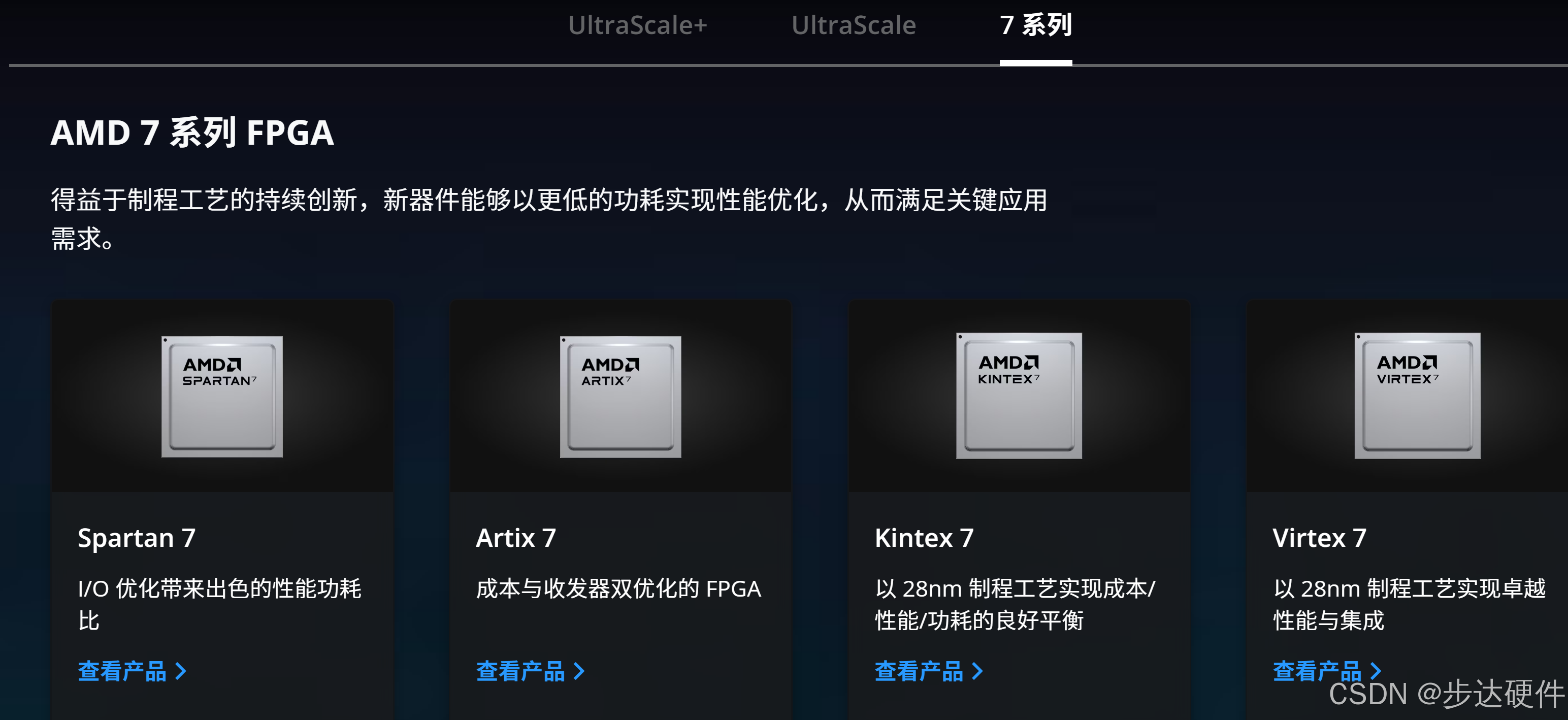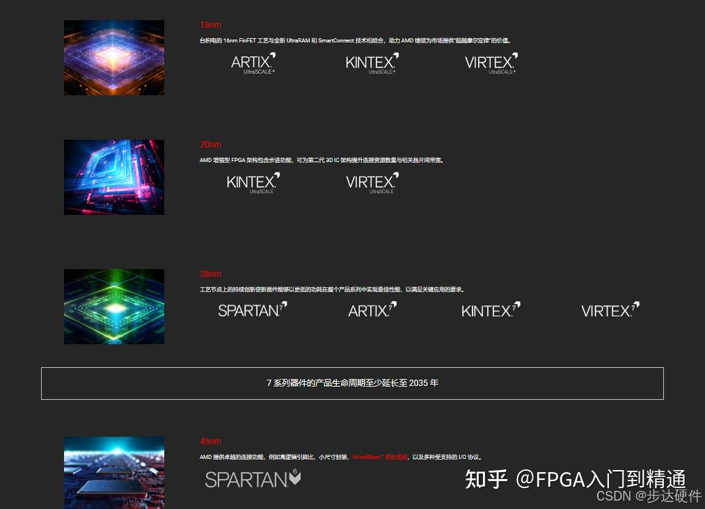 Spartan-7系列:作为入门级产品,具有最低的价格、功耗和尺寸,适用于低端应用。提供高性能的软处理器和DDR3支持,以及集成ADC和专用安全功能。