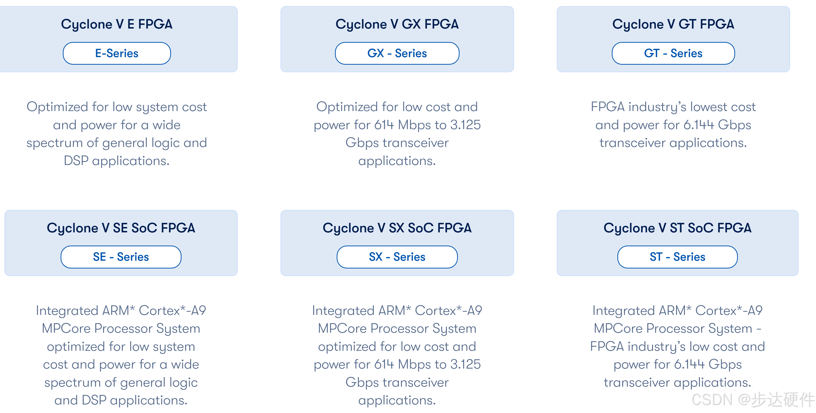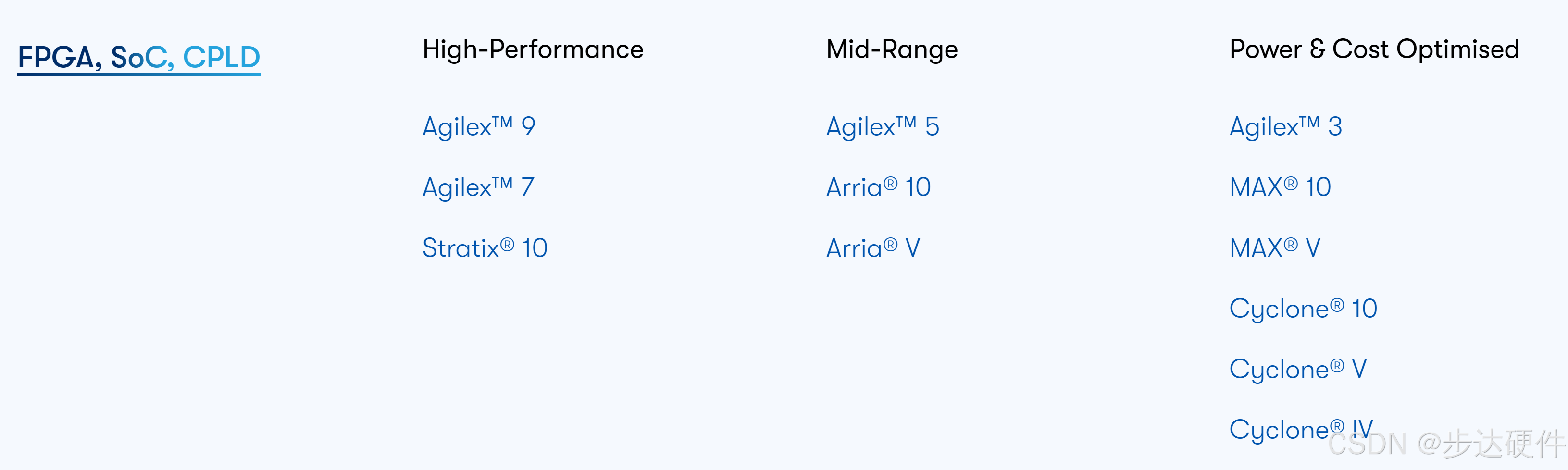 低功耗系列:Agilex 3、Max 10、Max Ⅴ、Cyclone 10、Cyclone Ⅴ、Cyclone Ⅳ ;