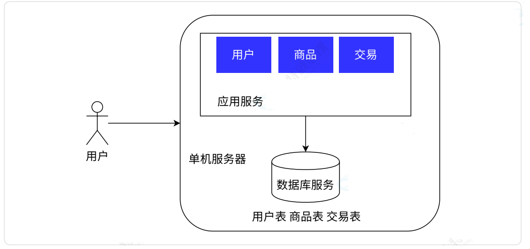 假设我们现在只有一台服务器,我们是一个小公司。这个服务器要负责所有的工作,其中要实现的业务就是电子商务,包括三个核心模块:用户,商品,交易,以及对应的数据库服务,当用户访问时商品服务时,假设我们的引用服务是使用cpp-httplib写的服务器,就会执行到商品的模块,然后根据需求,向数据库服务进行读/写,并且我们的应用服务和数据库服务都是在一台主机上的,如图: