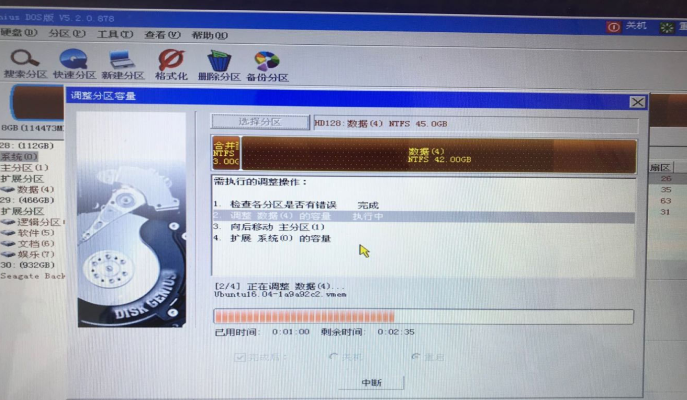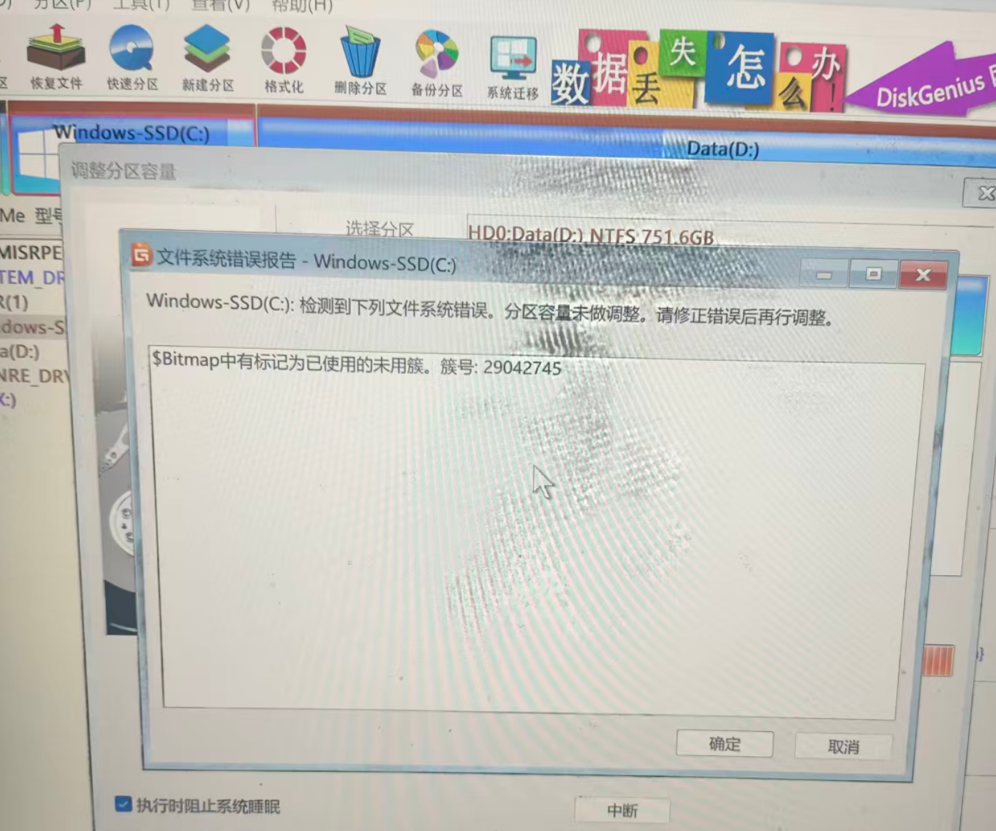 使用DiskGenius进行C盘扩容时,想把D盘的部分剩余空间转移到C盘,但是在重启后进入PE中,DiskGenius会报错"$Bitmap 有标记已使用的未用簇",错误信息截图如下: