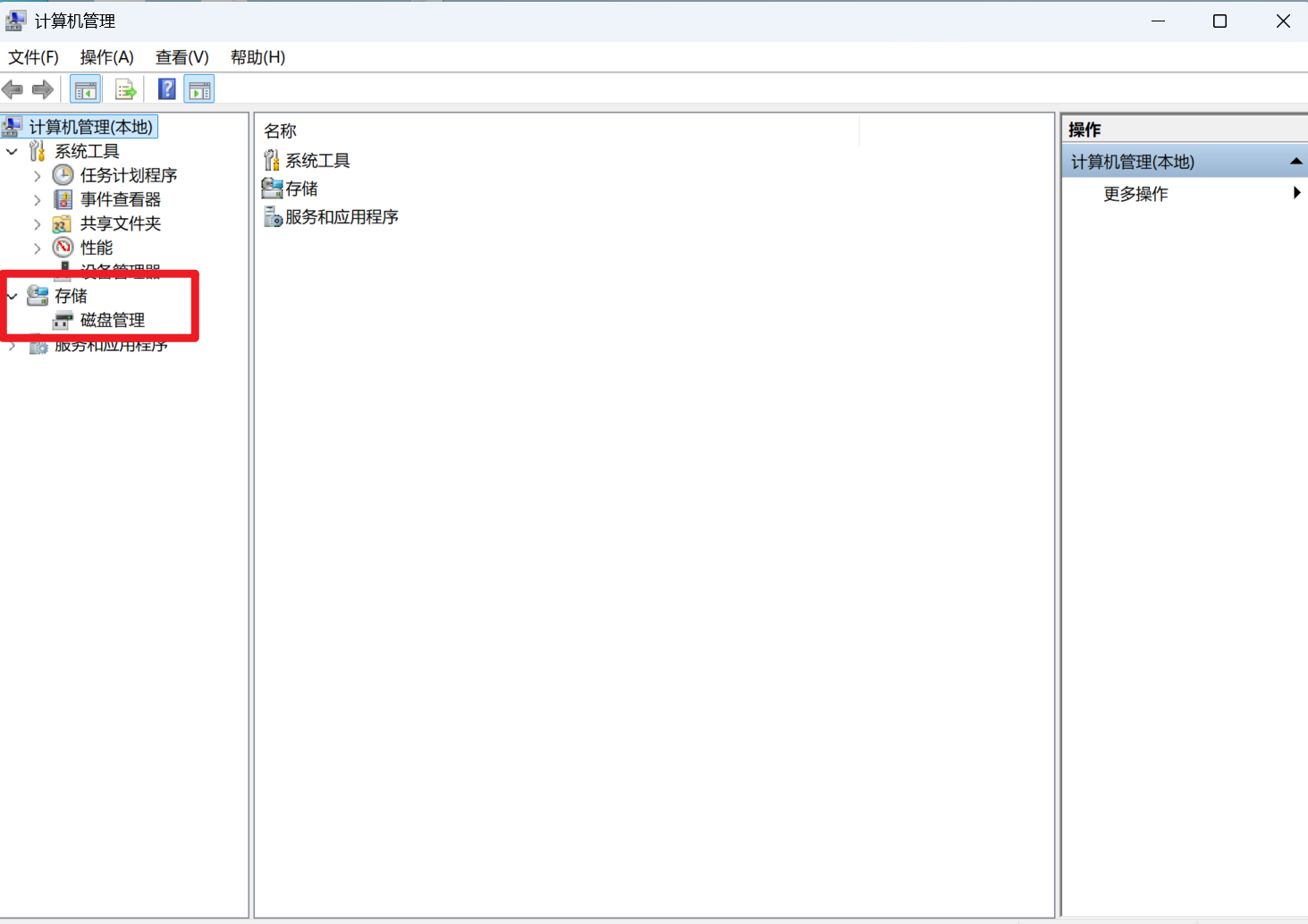 成功后打开Windows的磁盘管理,右键此电脑点击管理就会弹出下面弹窗,选择磁盘管理即可。