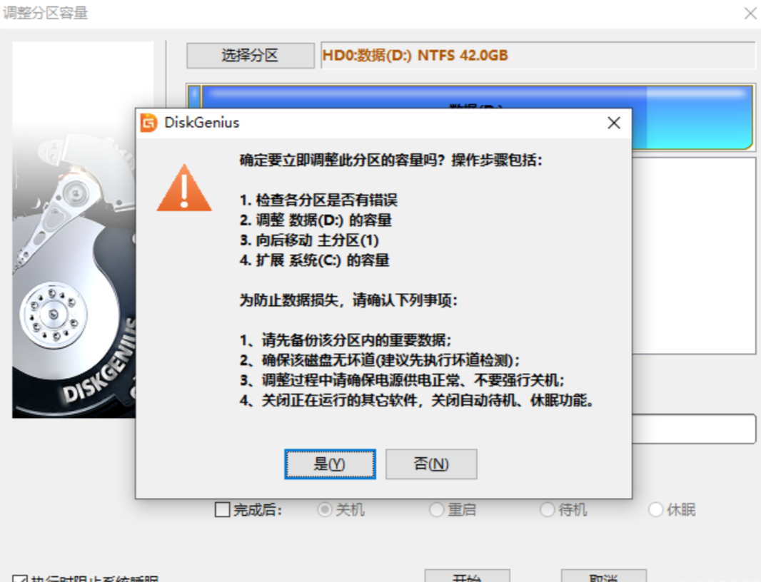 解决思路:使用DiskGenius对D盘进行调整分区大小,然后使用系统自带的磁盘管理工具将从D盘分出来的内存扩展卷到C盘