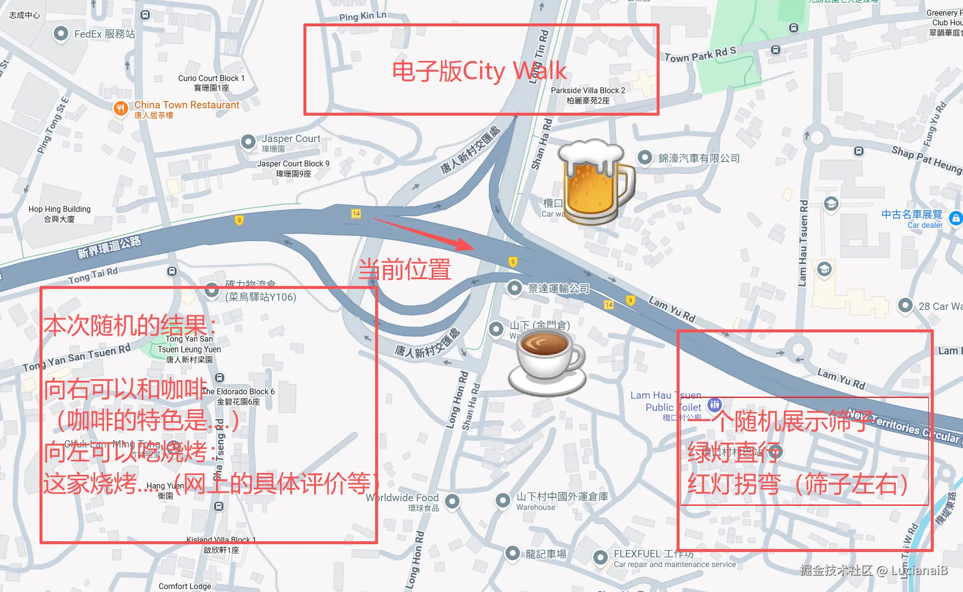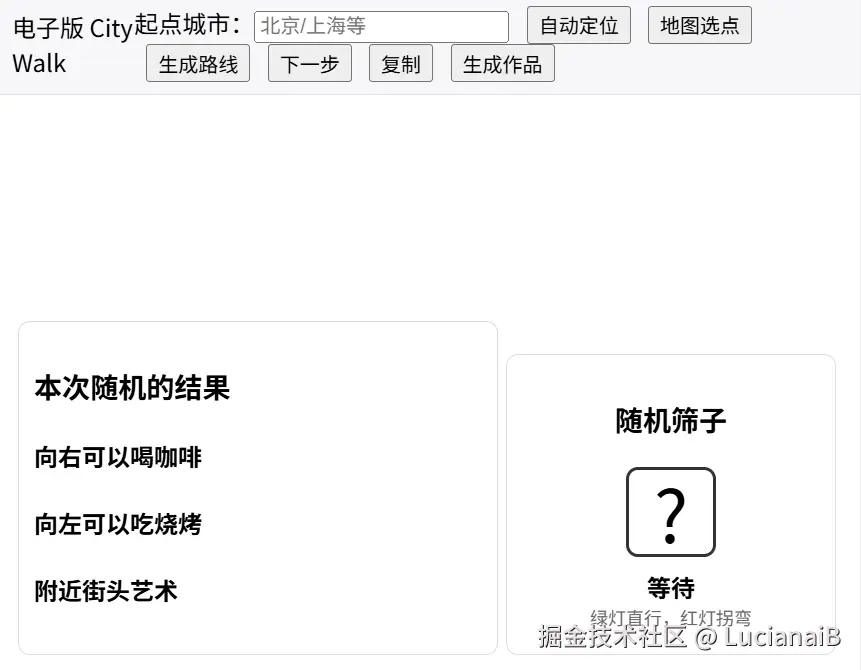 不用出门,打开网页,点击"开始漫步",AI就带着我在城市里"瞎溜达"------绿灯直行、红灯拐弯、路口掷骰子,还能推荐路边的宝藏咖啡馆和涂鸦墙。