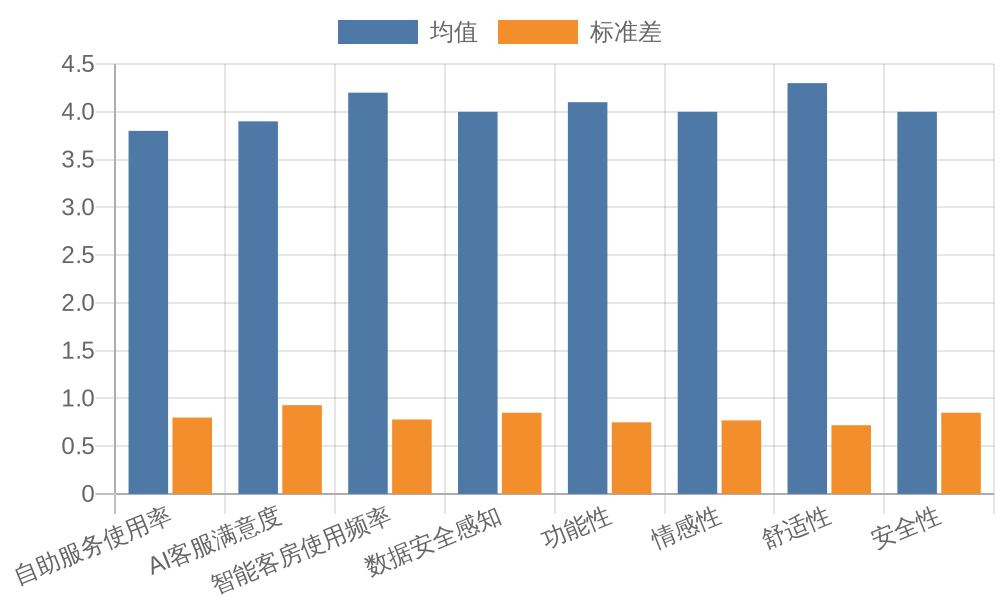 这些数据凸显智能技术应用的辩证影响:效率提升未必带来体验优化。本文发现当技术响应速度标准差超过1.2秒时,顾客舒适性评分出现断崖式下跌,说明技术稳定性比先进性更重要。未来研究可扩大至不同星级酒店比较,并引入技术接受模型(TAM)分析年龄群体的调节效应,这将有助于构建分层次的智能服务标准。