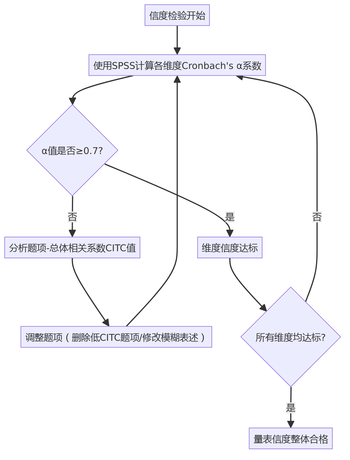 ....本表汇总各维度信度检验的初始状态、问题及调整方案,最终所有维度α值达标,确保量表数据稳定可信,为后续分析提供质量保障。