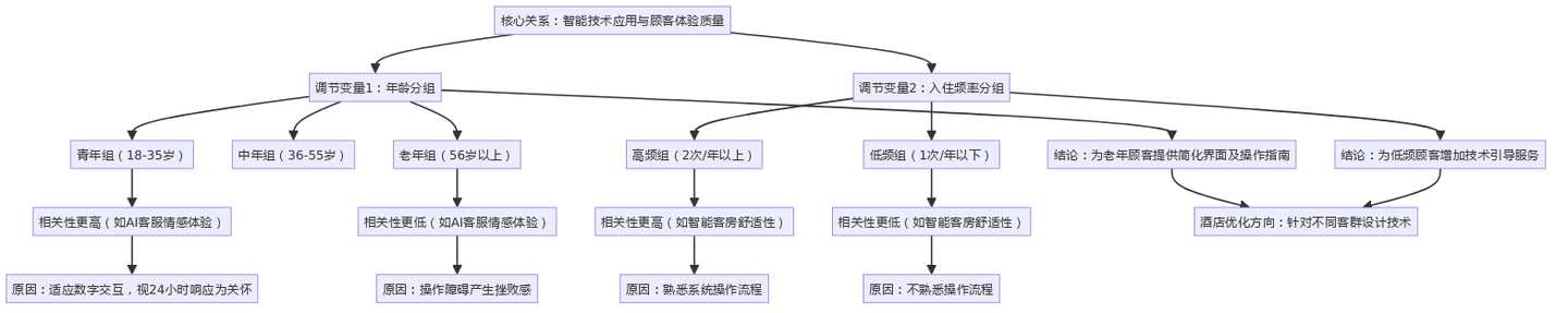 在顾客感知价值理论的基础上,本文进一步考察了年龄和入住频率等控制变量的调节作用。根据体验经济理论,不同特征的顾客对服务体验的感知存在差异,因此需要验证这些变量如何影响智能技术应用与顾客体验质量之间的关系。具体分析采用皮尔逊相关性检验的分组比较方法,将调查样本按年龄划分为青年组(18-35岁)、中年组(36-55岁)和老年组(56岁以上),同时按入住频率分为低频组(1次/年以下)和高频组(2次/年以上)。