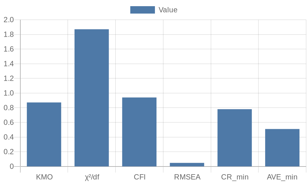 效度分析是为了确保问卷能够准确测量智能技术应用和顾客体验质量。本文采用探索性因子分析(EFA)和验证性因子分析(CFA)检验量表结构效度。首先对智能技术应用量表进行EFA分析,采用主成分分析法抽取因子。KMO值为0.872(大于0.7的标准),Bartlett球形检验($$\chi^2=1285.37, p<0.001$$),表明数据适合做因子分析。分析结果显示特征根大于1的因子共有4个,累计解释方差达68.3%。各题项因子载荷均大于0.6,且无交叉载荷现象,智能技术应用的16个题项被清晰地归入功能性(如自助入住效率)、情感性(如AI客服互动体验)、舒适性(如智能客房灯光调节)和安全性(如人脸识别可靠性)四大预设维度。