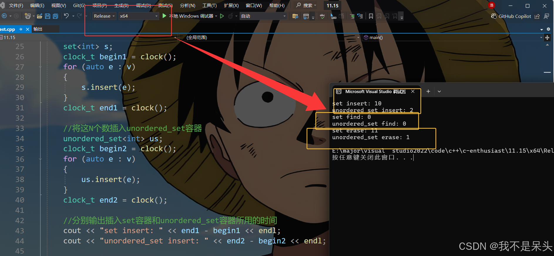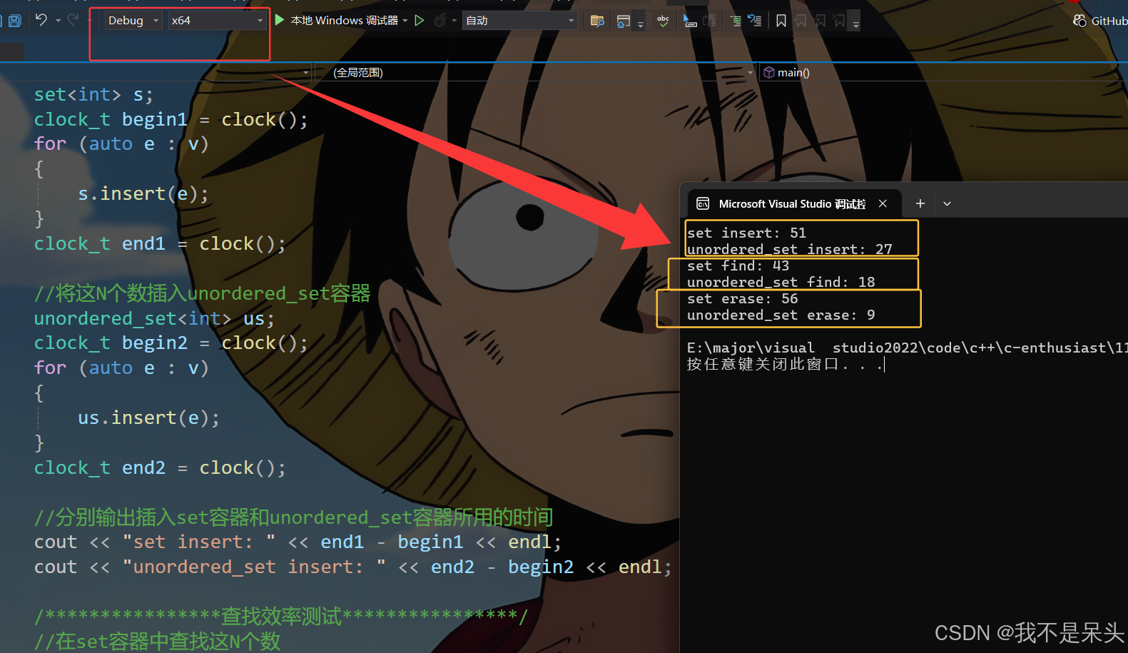 当N为100000时,set容器和unordered_set容器增删查改的效率差异并不大,在Debug版本下的测试结果如下: