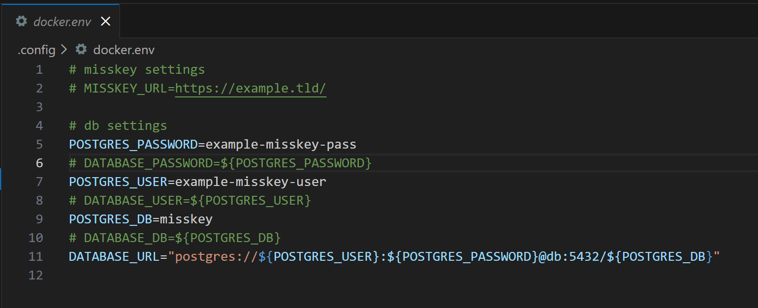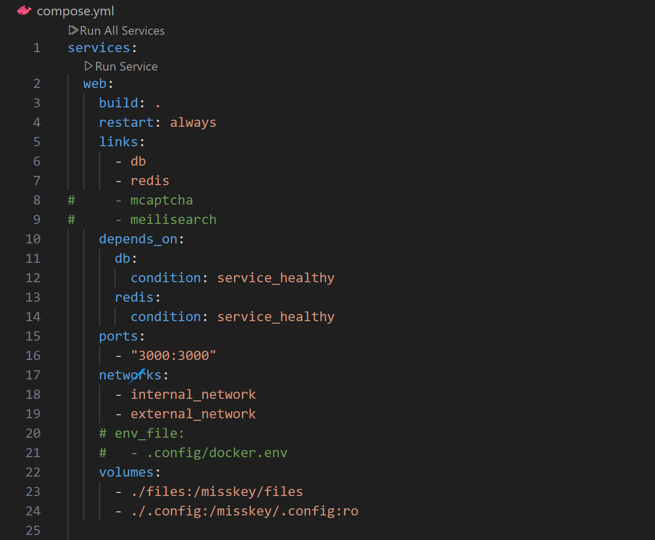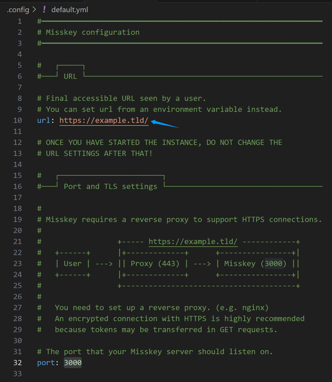 文件中的3000:3000,前者表示web端口,如果3000被占用了,可以更改其他的空闲端口号,后者为Misskey项目在docker容器中监听的端口,可以不用修改。特别值得注意的是,更改web端口号只需要更改这一个文件即可