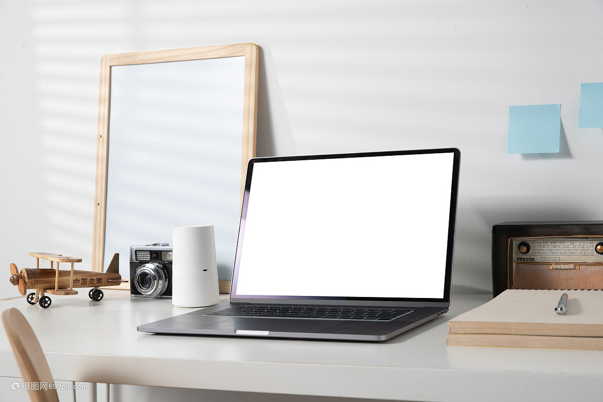 图片元素:白色桌面上放着一台笔记本电脑,旁边有相机、收音机、飞机模型等物品。