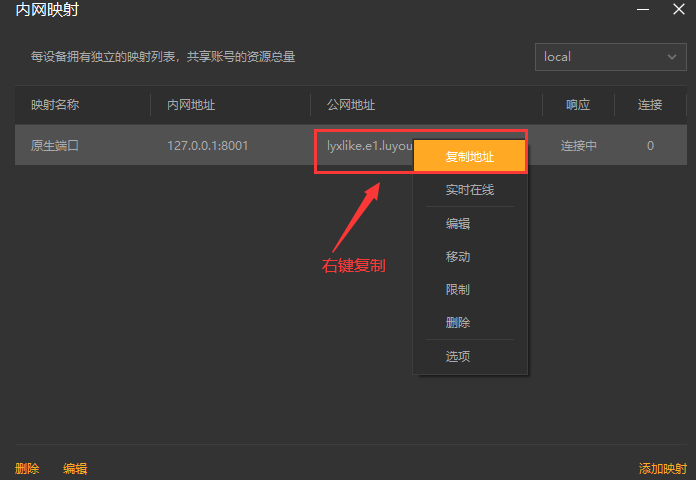 5,创建好后,就可以看到一条映射的公网地址,鼠标右键点击【复制地址】。
