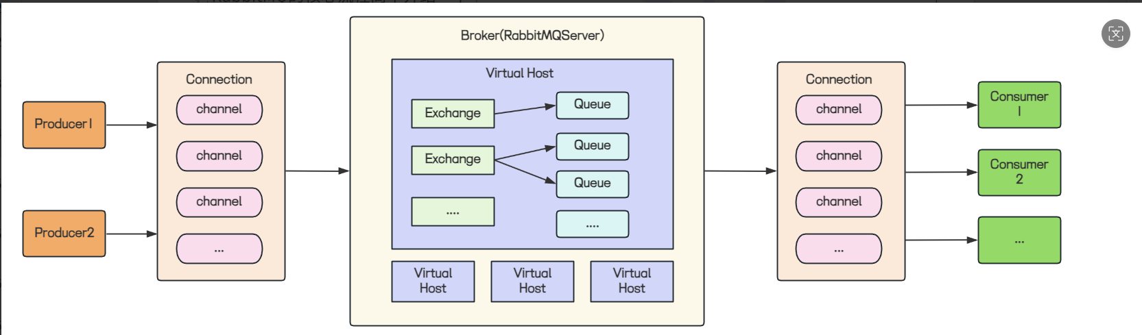 - 创建连接: Producer 连接到RabbitMQBroker, 建⽴⼀个连接(Connection), 开启⼀个信道(Channel)