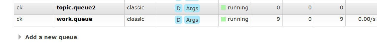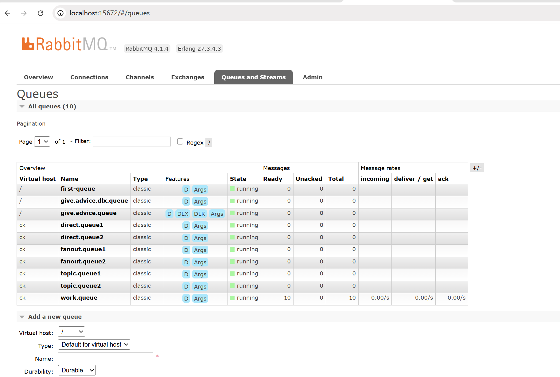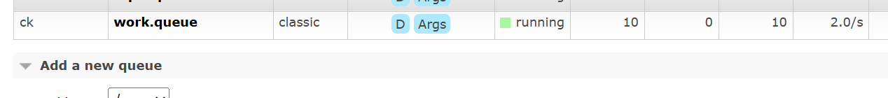 我们注释掉消费者代码,然后给work.queue这个队列生产十个消息,