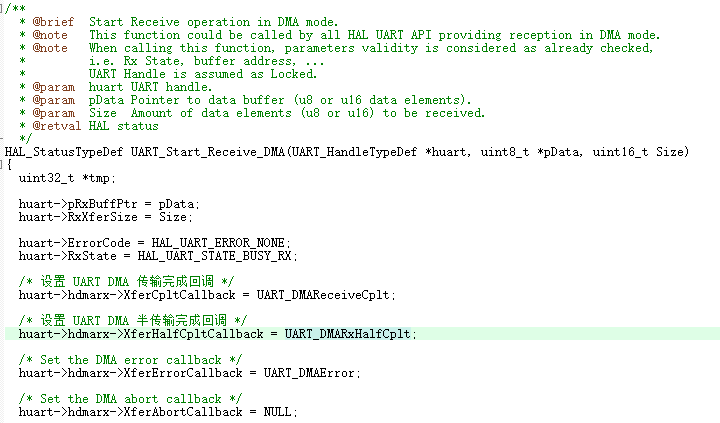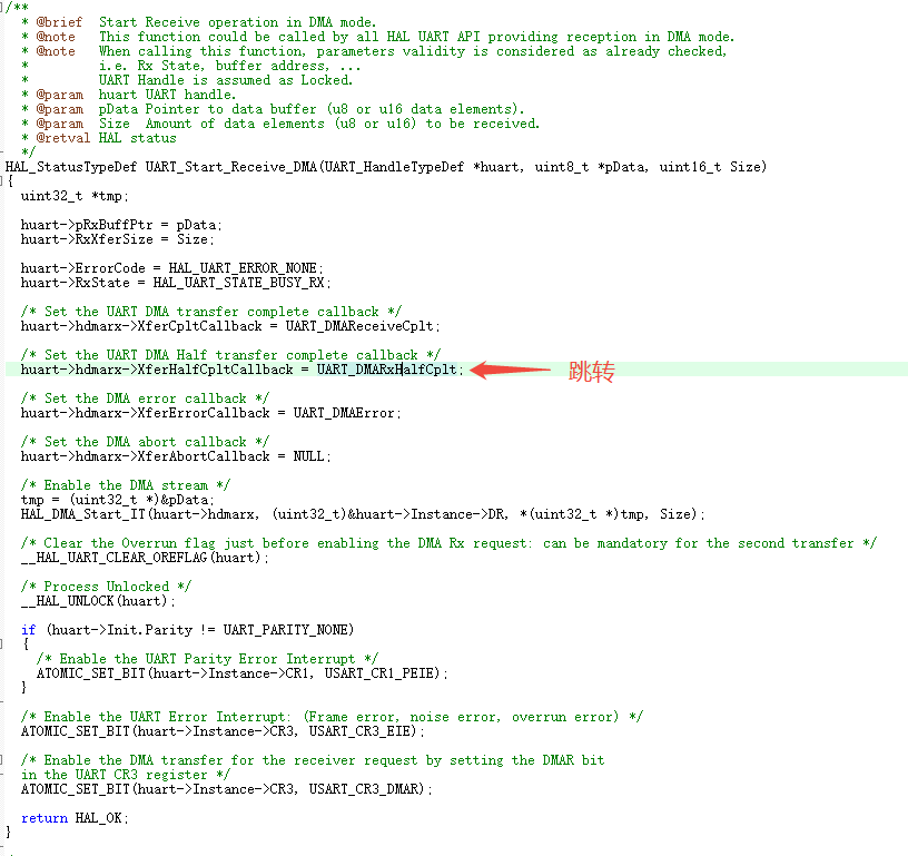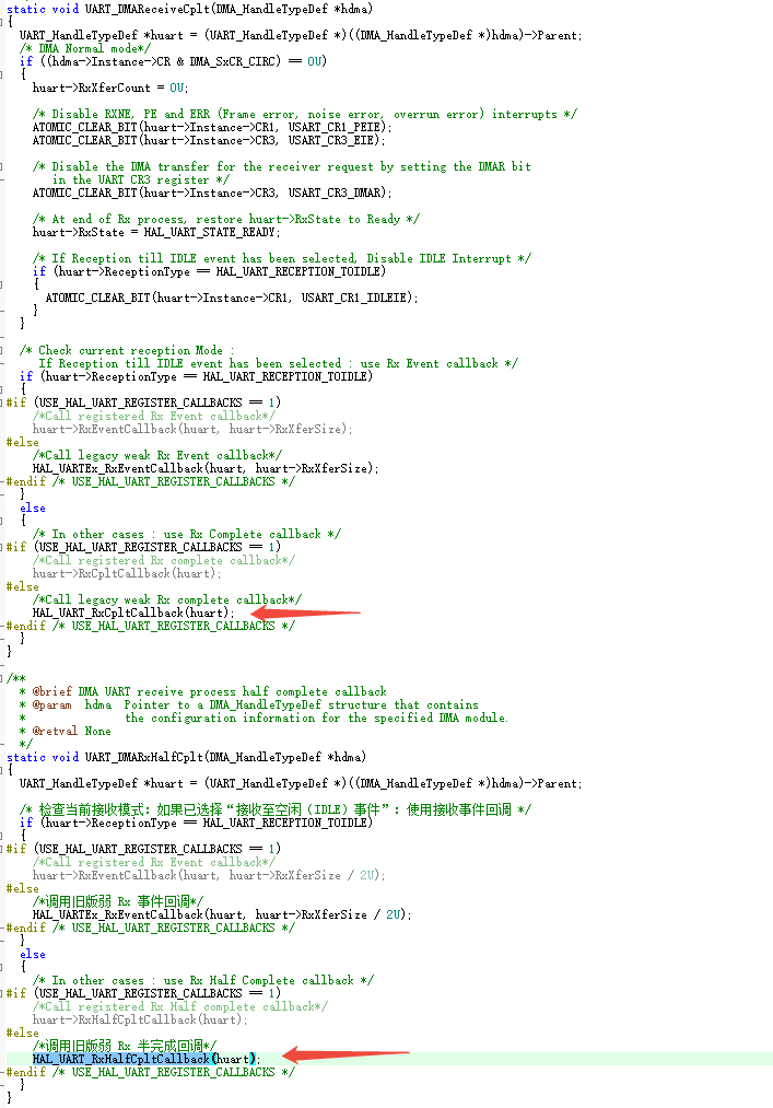 再看全满函数。同样的是判断这个值是不是标记位有没有被设置成空闲事件,如果是同样执行"HAL_UARTEx_RxEventCallback(huart, huart->RxXferSize / 2U);"