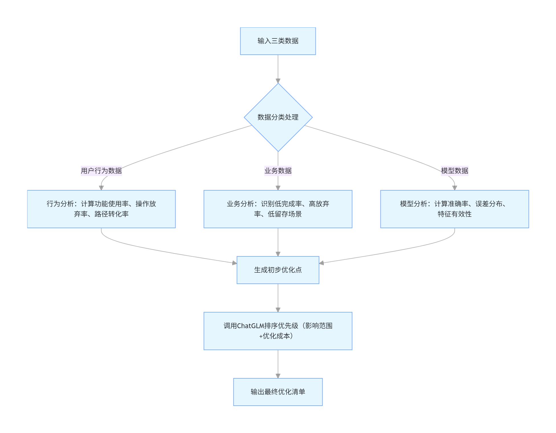 | B. 智能分析层 | 从数据中挖掘优化点,用大模型排序优先级 | 行为分析算法 + 模型评估指标 + ChatGLM 意图识别 | 优先级优化清单(critical>high>medium) |