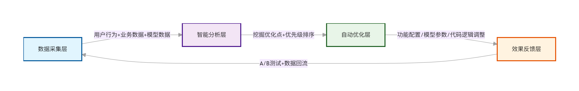 | D. 效果反馈层 | 验证优化效果,形成闭环确保有效 | A/B 测试 + 效果评估指标 + 数据回流机制 | 优化效果报告(指标提升 / 下降数据) |
