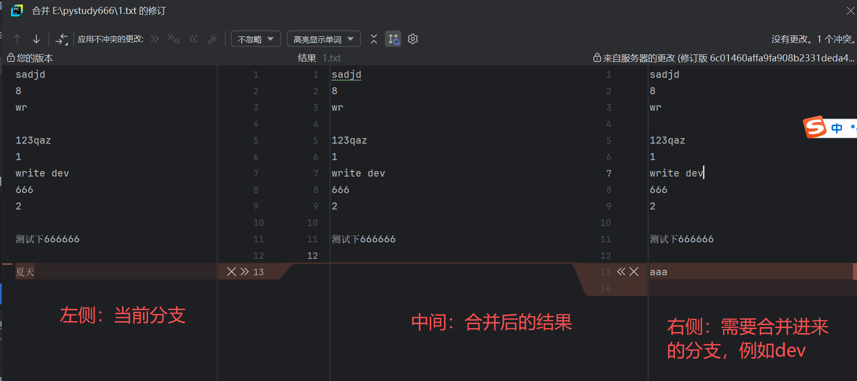 1、左侧:当前分支(你正在合并到的分支,如 master)