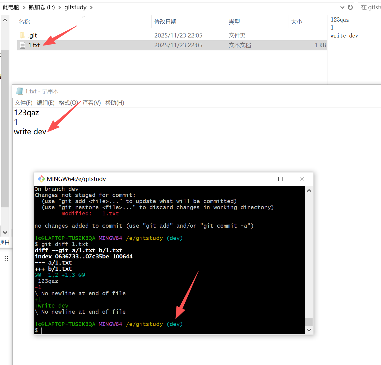 在分支dev上,修改文件1.txt,增加文本:write dev