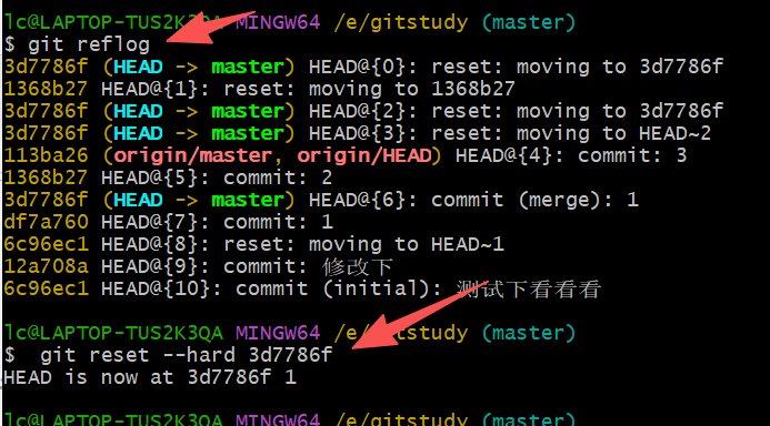 假如我们回退的版本错了,git log 没有回退的记录,git reflog可以取消刚才的回退。