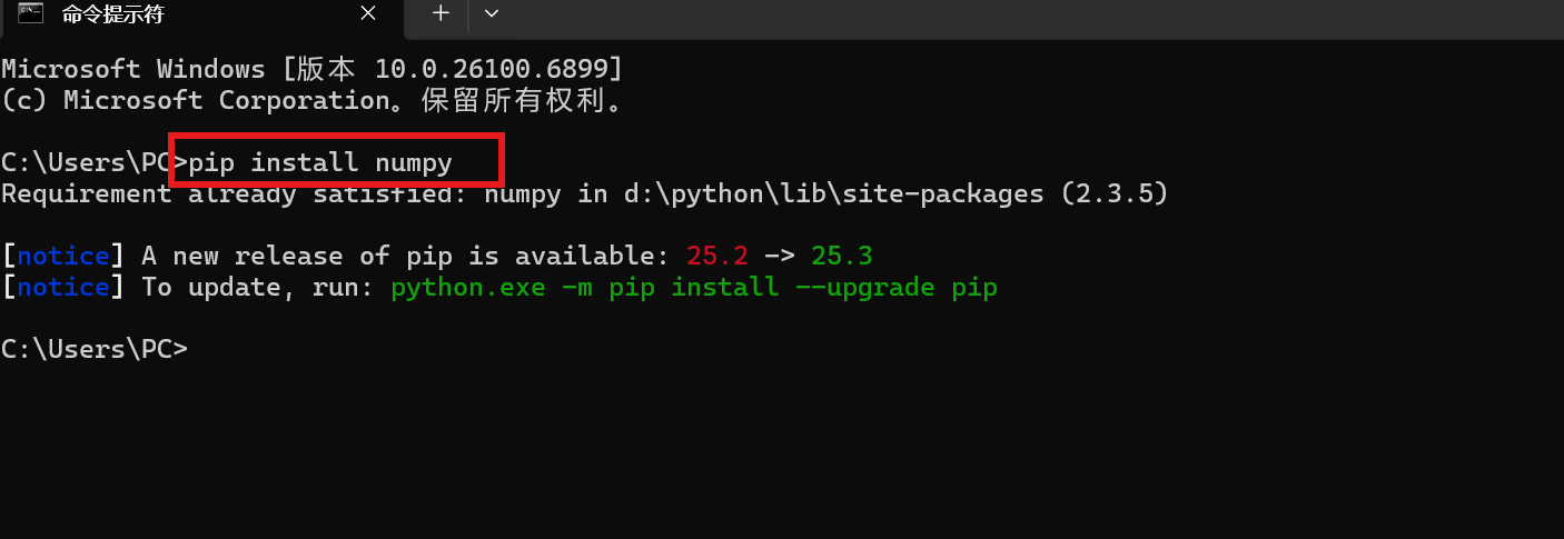 安装完成后,会提示 "Requirement already satisfied"(若已安装)或 "Successfully installed"。
