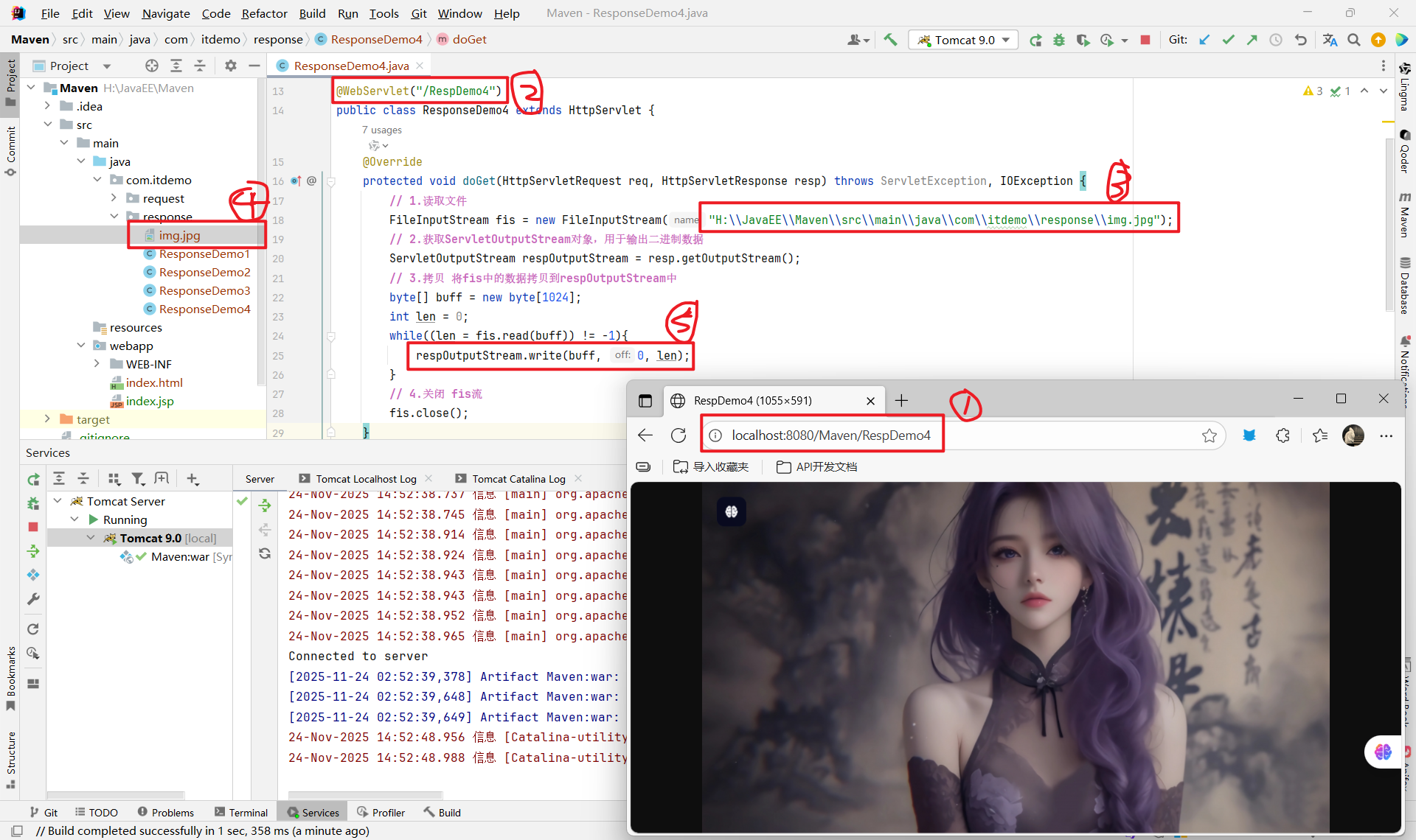 使用 response.getOutputStream() 获取字节输出流,用于输出二进制内容(如图片、文件下载)。 示例:
