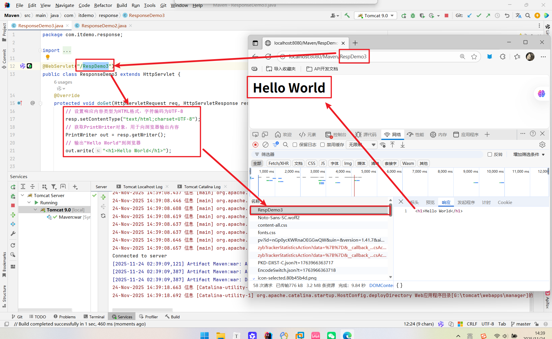 使用 response.getWriter() 获取字符输出流,用于输出文本内容(如 HTML、JSON)。 记得先设置编码: