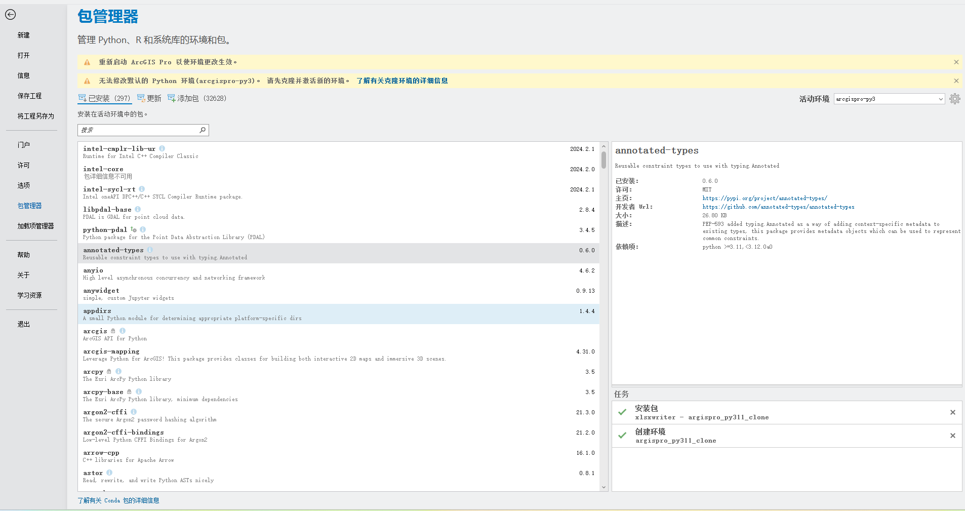 打开ArcGIS Pro的设置-->包管理器,可以看到软件自带的arcpy: