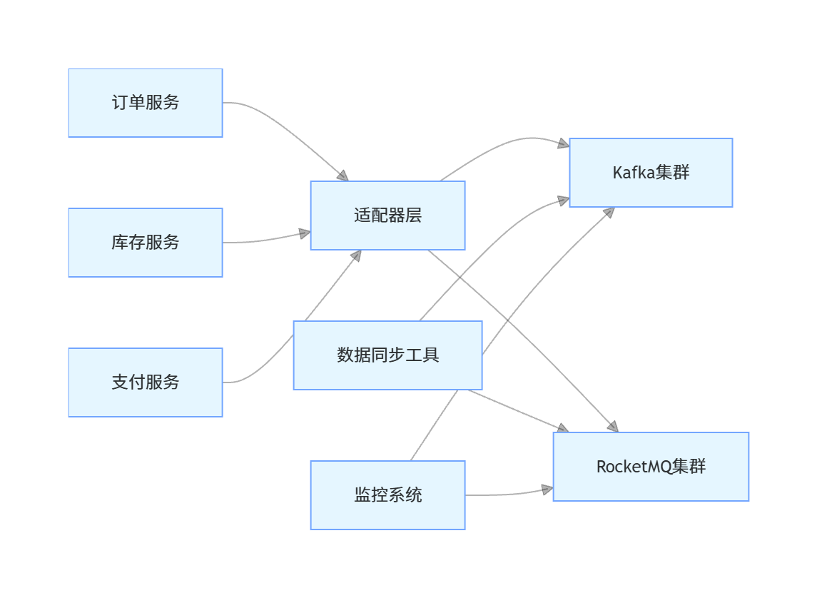 Kafka 和 RocketMQ 的 Producer/Consumer API 差异较大,直接替换会导致大量代码修改。采用适配器模式封装统一接口,可实现业务代码无感知切换。
