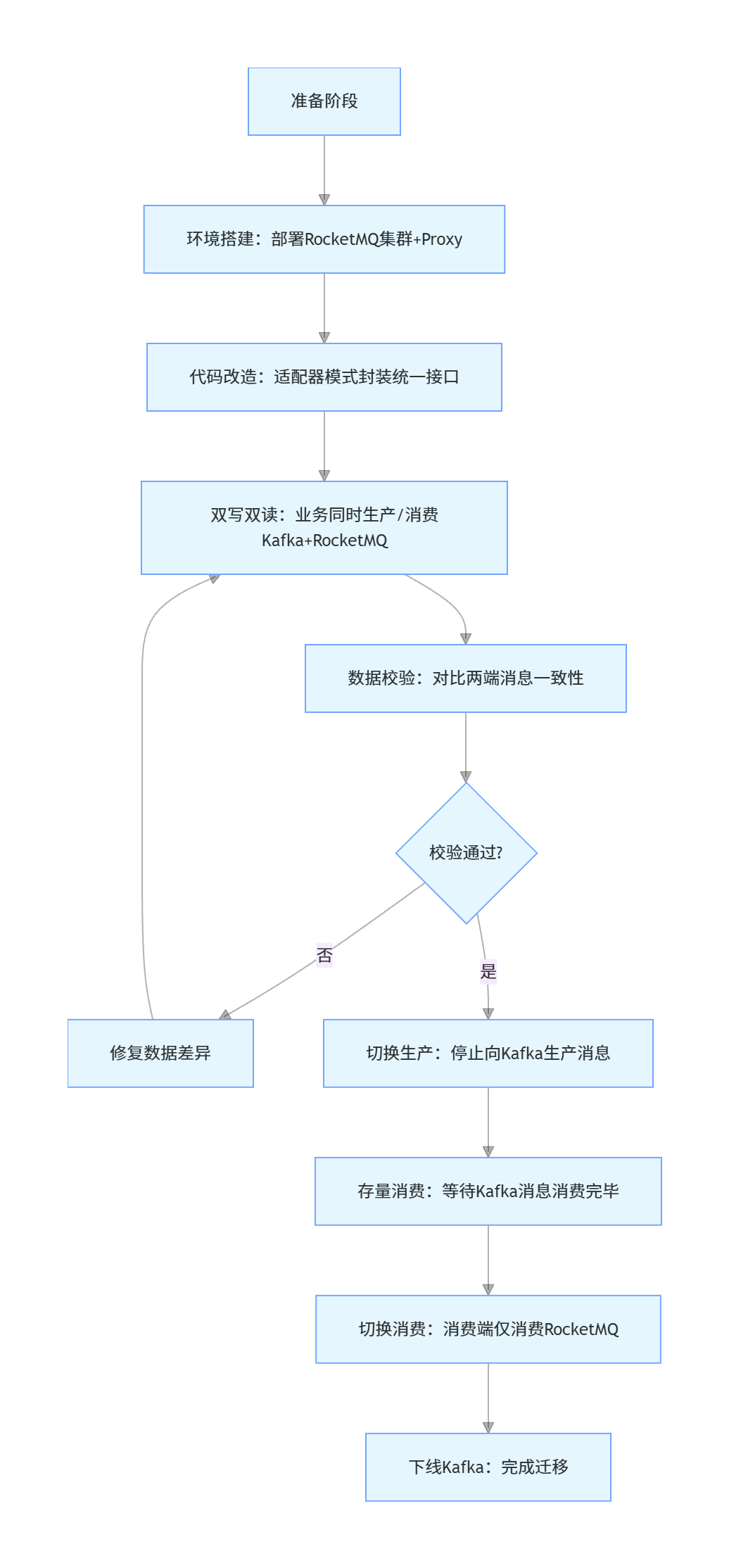 从 Kafka 迁移到 RocketMQ 并非简单的 "替换组件",而是需要结合业务场景设计平滑过渡方案: