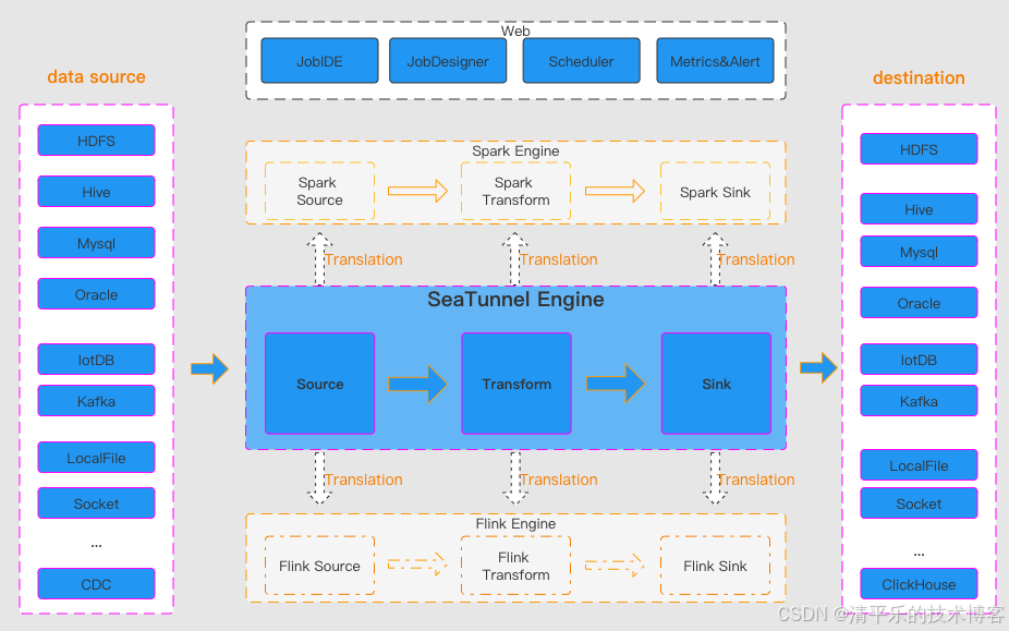 负责从各类数据源读取数据,支持全量、增量、CDC 等多种读取模式。目前已支持超 100 种连接器,覆盖关系型数据库(MySQL、PostgreSQL)、大数据存储(HDFS、Kafka)、时序数据库(InfluxDB)等。例如 JdbcSource 适配主流 JDBC 数据源,KafkaSource 可对接消息队列实现流式数据消费,同时通过并行读取、连接复用技术提升数据抽取效率。