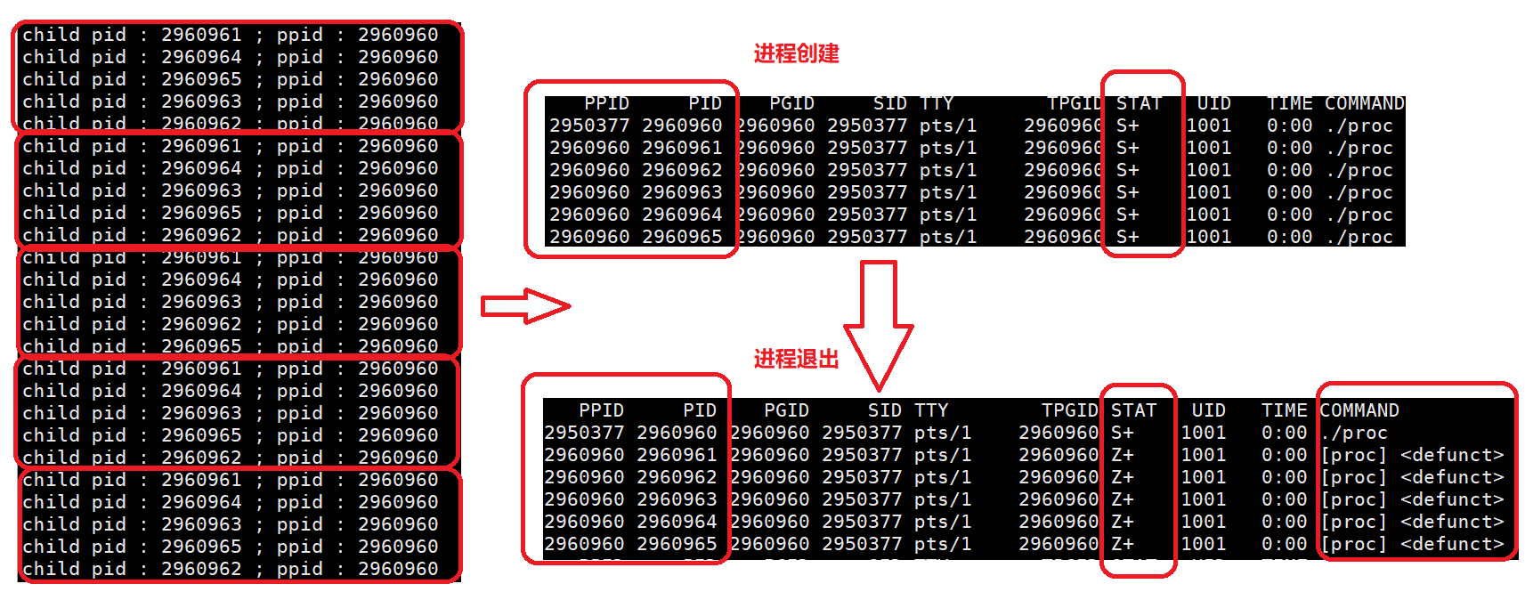 - 使用循环的方式创建出5个进程,由于父进程没有对这5个进程进行回收,导致这5个进程变成僵尸进程。