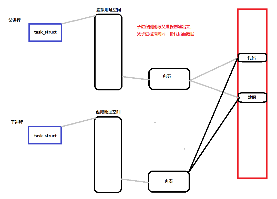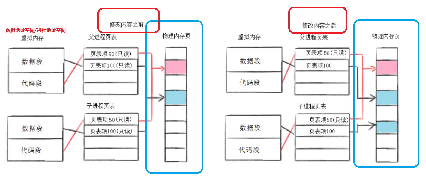 进程在刚被创建出来的时候,操作系统会将父子进程页表的内容都设置成只读权限的,当一个进程触发修改的时候,触发写时拷贝,让修改后的数据重新在物理内存中开辟一段空间,并建立映射,同时将这部分数据在页表中修改成可写权限