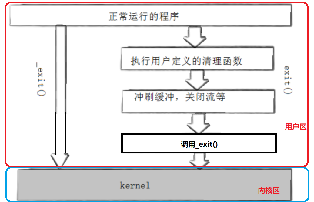exit和_exit都可以让进程退出,但是却有不同,_exit系统调用接口,而exit是C语言封装的_exit函数,相当于exit最有也会调用_exit,但是在调用_exit之前,还做了其他工作: