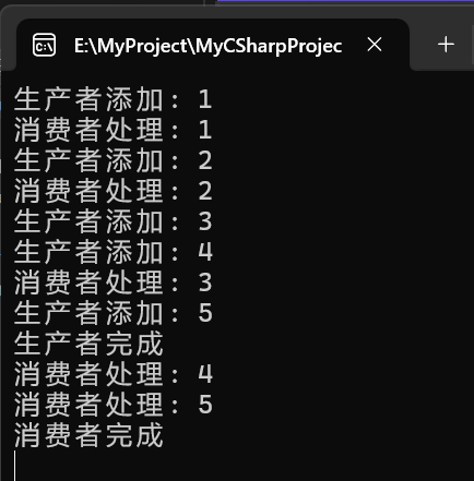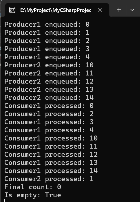 Console.WriteLine($"Producer1 enqueued: {i}");