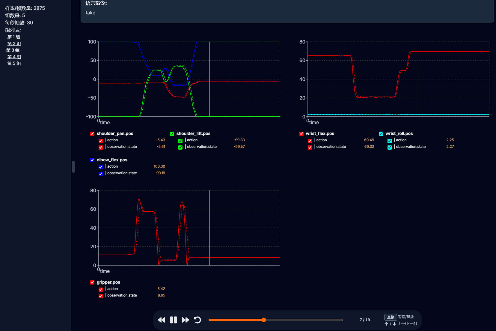 简单来说,action 是你想让机器人做什么 ,observation.state 是机器人告诉你它现在做了什么 。lerobot-dataset-visualizer 通过可视化这两者,帮助你理解和分析机器人的运动行为和控制性能。