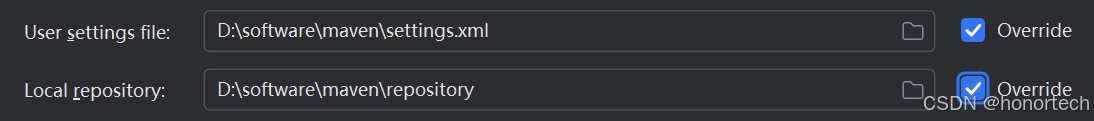 在 IDEA 中配置了 Maven 自定义本地仓库路径 D:\software\maven\repository,且自定义 D:\software\maven\settings.xml 中已通过 节点指定该路径,但依赖仍默认下载到 C:\Users\用户名.m2\repository。