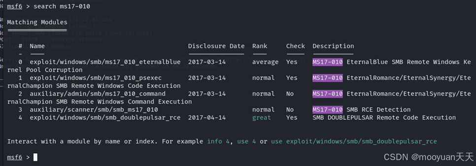 Ms17-010为永恒之蓝攻击模块名称,使用search ms17-010查找,具体如下所示。