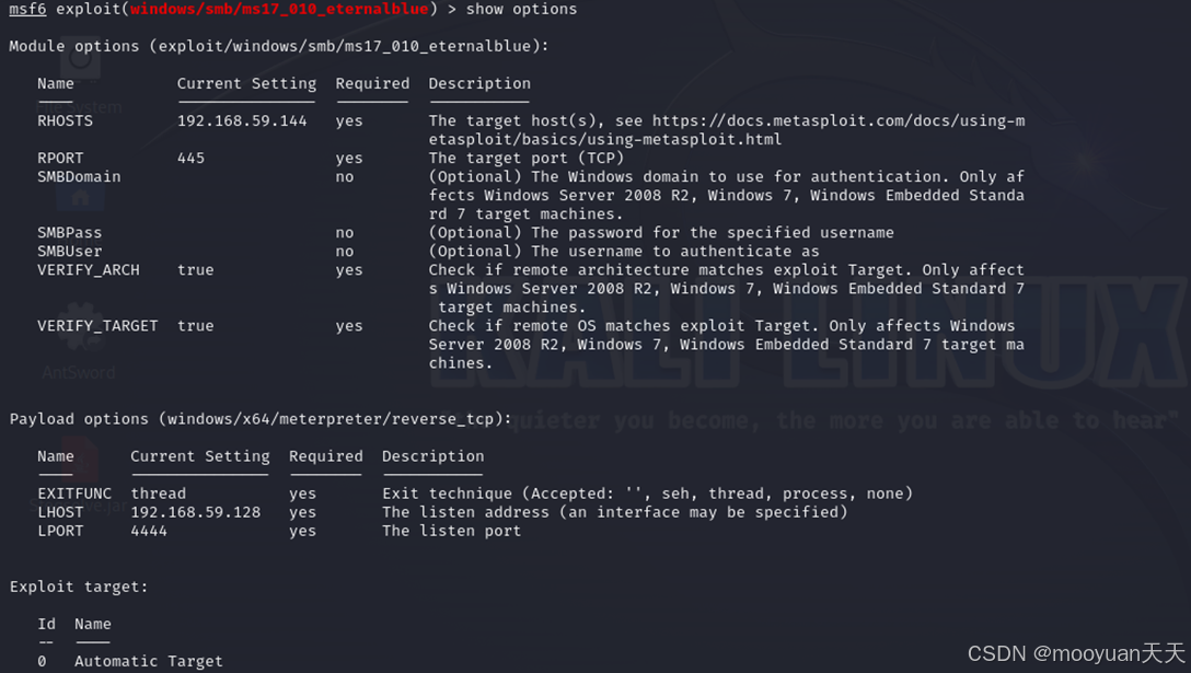 执行完毕后通过show options查询配置,目标靶机的 ip 地址为 192.168.59.144 ,端口号为 445 ,与配置一致,攻击的机器ip 地址为 192.168.59.128,与配置一致,如下所示配置无误。