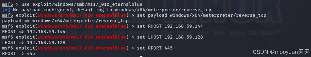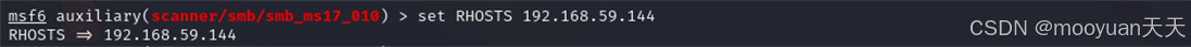 使用set rhosts 192.168.59.144设置靶机的ip地址为攻击目标,如下所示。