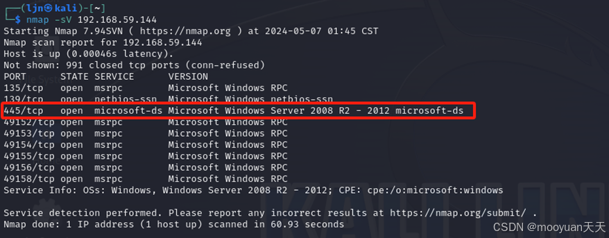 使用nmap命令探测靶机445端口是否开启,如下所示,靶机存在445端口开启的问题,可能存在永恒之蓝漏洞,如果此步骤失败,说明你得靶机环境搭建出现问题,很大可能是防火墙没关闭或者打了补丁,需要重新搭建环境。