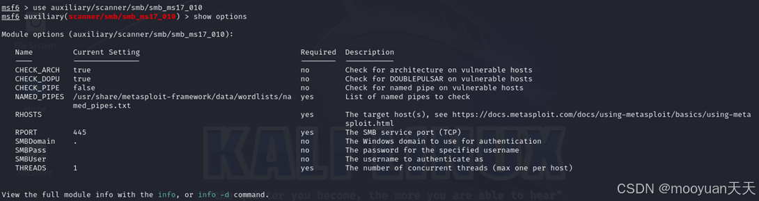 使用use 0进入永恒之蓝扫描模块,并展示配置选项,如下所示。