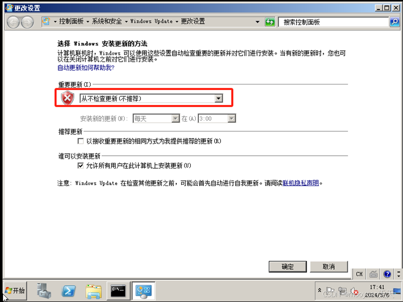 为了确保漏洞被成功复现,还需要关闭更新,只有没有安装MS17-010 安全补丁的系统才可以复现永恒之蓝漏洞。