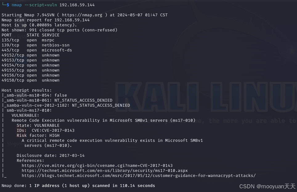 使用nmap --script=vuln 192.168.59.144探测漏洞, 运行所有与漏洞检测相关的 Nmap 脚本,如下所示靶机上扫到了4个漏洞,其中包括了MS17-010。