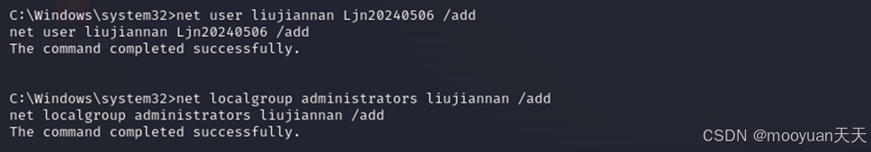 使用net user 用户名 密码 /add创建一个新的本地用户账户。其中"用户名"指定账户名称,"密码"设置登录密码,/add参数表示执行添加操作。该命令仅创建普通用户,权限有限。使用net localgroup administrators 用户名 /add将指定用户提升为管理员权限的命令。它将用户添加到系统的"administrators"本地组中,使其获得完全的系统控制权,包括安装软件、修改系统设置、管理其他用户等高级权限。