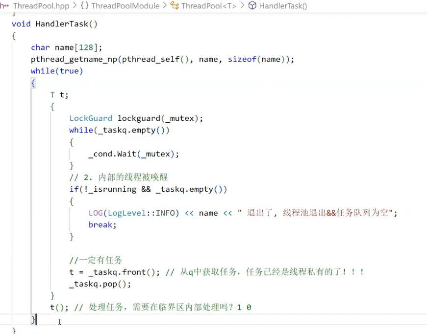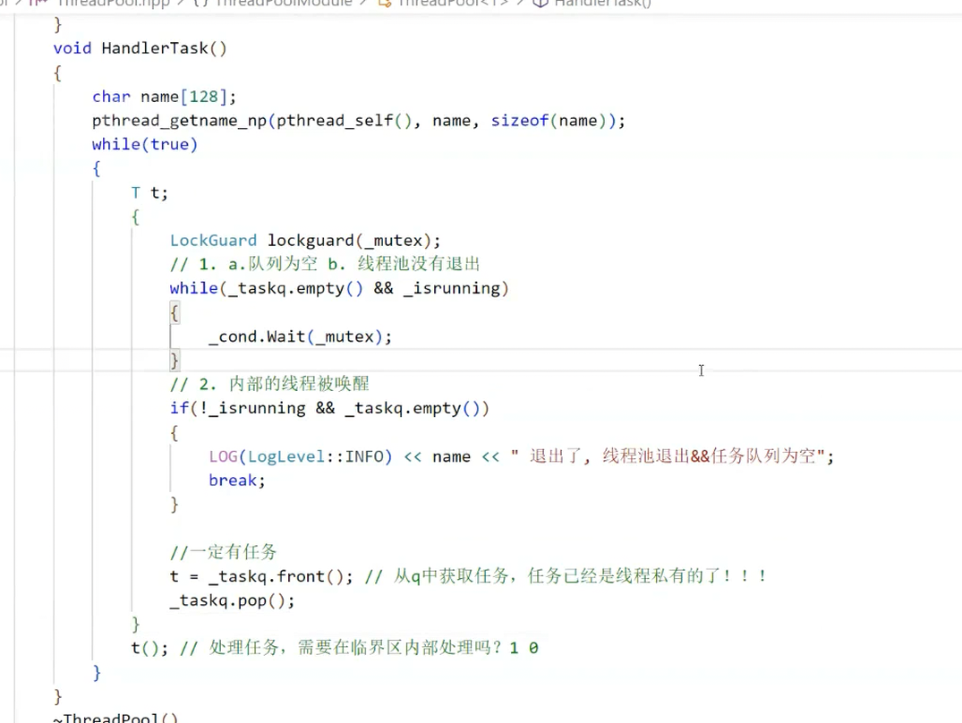 被唤醒的线程会再次检查退出条件。此时 is_running 为 false,并且如果任务队列也为空,线程就会执行退出逻辑。